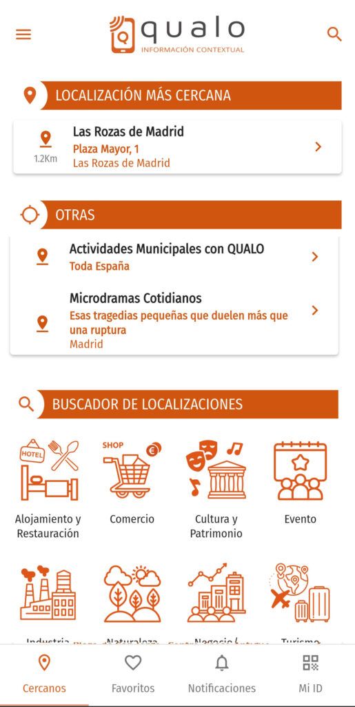 Clicando en «Localizaciones cerca de mí» se desplegarán aquellos lugares o localizaciones que QUALO ha detectado cerca de donde te encuentras. Podrás seleccionar la que desees. Por ejemplo, en un centro comercial es posible que QUALO esté detectando los diferentes locales o negocios que sean Zonas Qualo. O en una calle, los distintos lugares de interés QUALO a tu alrededor.