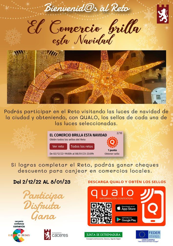 On the occasion of the Christmas holidays 2022/23, the Department of Business and Commerce of the City Council of Cáceres launched a new initiative to promote local commerce and encourage citizens and visitors to know the Christmas lights of the city in a more playful and interactive way than ever. Citizens and visitors can visit the different sites of lights selected for the Challenge and get the stamp that proves that you have visited them, using the QUALO app. If they manage to obtain all the stamps and complete the Challenge, they automatically participate in the draw for 5 checks redeemable for use in any of the local stores in the city.