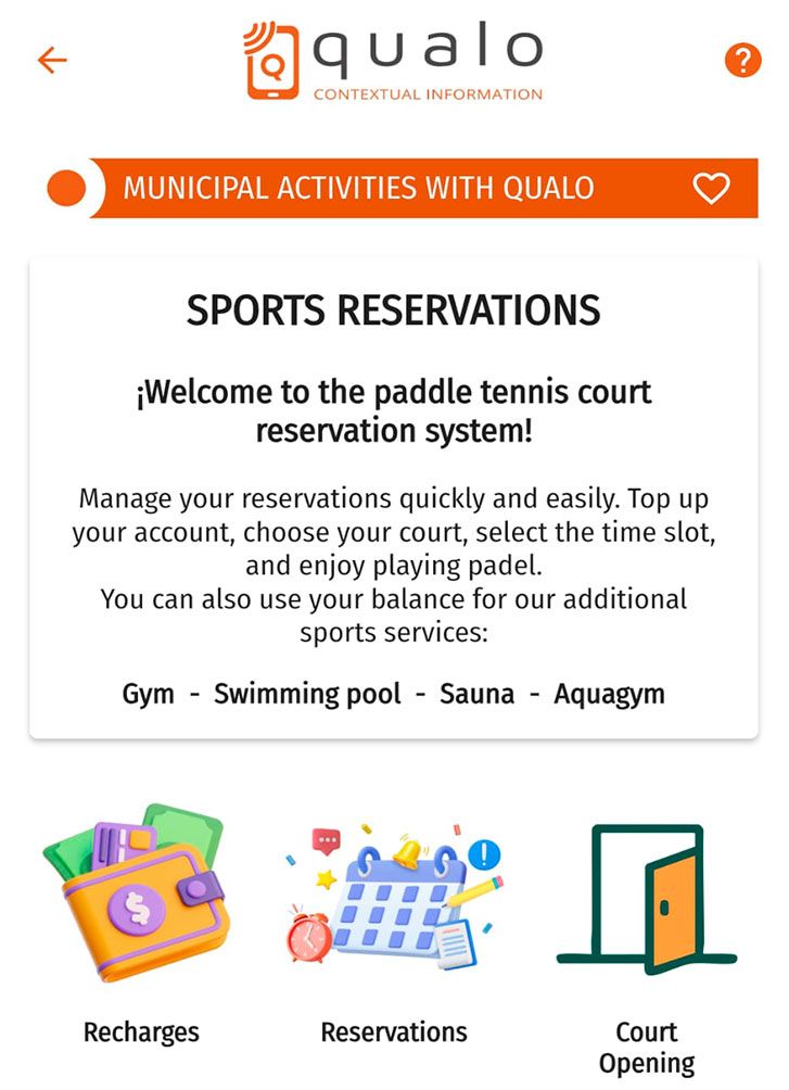 The user accesses the “Municipal activity booking” section from QUALO or the web app (as in the court booking demo we saw).